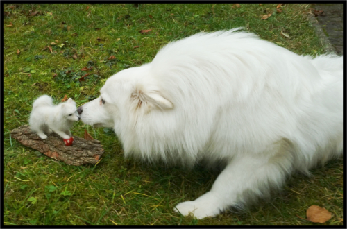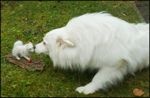 Rikki begutachtet freundlich seinen Spitzfreund :)Gefilzt mit seinem Fell, welches ich beim Bürsten für seine Miniatur gesammelt habe.